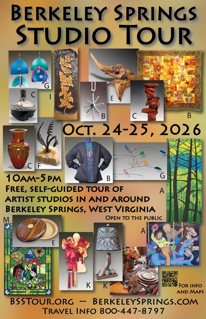 The Berkeley Springs Studio Tour is a free, self-guided driving tour through the scenic hills of West Virginia. Held every October, the tour offers a rare opportunity to visit the private studios of nationally and regionally known artists working in a wide range of media.